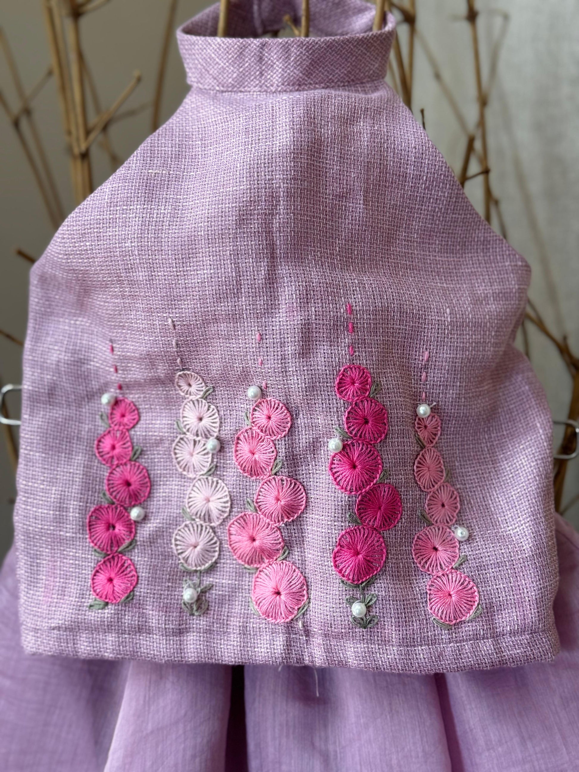 A soft celebration of colour and craftsmanship, the Lavender Whimsy Lehenga Set features a pure linen blouse paired with a flowing mul chanderi skirt. The high-neck blouse with stunning hand embroidery in ombre pink florals and delicate pearls and the 6 panelled skirt adds gentle movement and grace—making it the perfect choice for festive gatherings, birthday portraits, and special occasions.